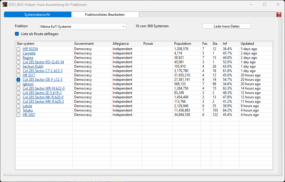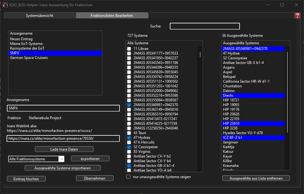 Eine durch eigene Auswahl von Systemen gesteuerte Systemübersicht von Inara. Man kann dort eigene Listen von Systemem für verschiedene Fraktionen erstellen und es werden dann nur die Systeme aus dieser Systemliste dargestellt. Derzeit wird nur die Systemübersicht von Inara dargestellt. Damit muss man sich nicht mehr durch 100te von Systemen scrollen, um die gewünschten Systeme zu finden.